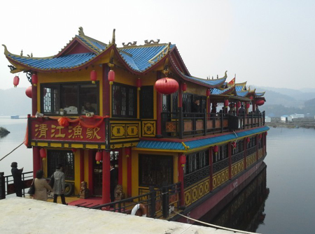 天龙湾只有三两栋简洁的建筑物,呈乳白色。设施却很齐全、现代,也很舒适。西侧有一大块沙滩。沙滩上两三把遮阳伞就那么斜斜地立着,默默地注视着大门前晃进晃出的游人。沙滩旁有四五处草棚,不知是渔民的临时住所,还是专为浪漫的情侣们搭建的天堂。建筑物周围树木掩映,岸边垂柳依依。正门前的桃林令人心旷神怡。花骨、花蕾、花瓣、花蕊、花朵,让你一次看过够。没有一匹叶儿,一干树鲜红鲜红的桃花儿,娇艳得不敢当真、心痛。出门右拐十几步是一个小山包,树木茂密。因为水草丰盛,小鸟衣食无忧,在树林里快乐地追逐、幸福得叽叽乱叫。